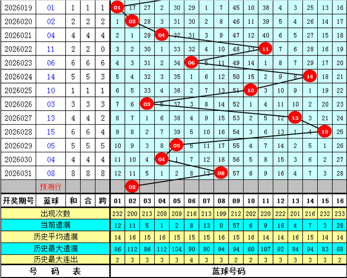 蓝球:历史同期0路号开出:03、06、09、15;1路号开出;01、04、07、13、16;2路号开出;08、11,蓝球012路个数比为9:12:2,目前2路号历史同期相对较冷,遗漏8年,今年同期适当关注回补,看好蓝球02。